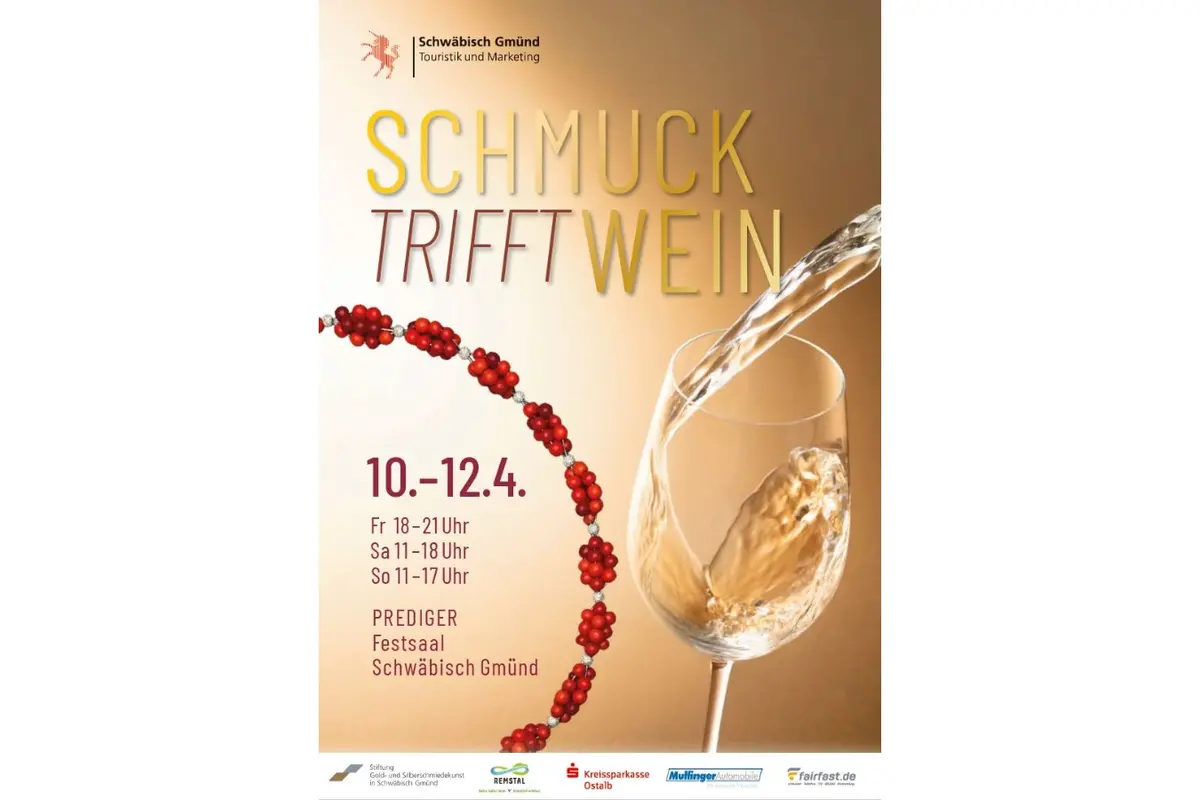 „Schmuck trifft Wein“ wird am Freitag, 10. April, um 18.30 Uhr durch Oberbürgermeister Richard Arnold eröffnet; die musikalische Umrahmung übernimmt Marcus Theinert am Klavier. Anschließend präsentieren vierzehn Schmuckschaffende aus Schwäbisch Gmünd bis Sonntagabend ihre handgearbeiteten Unikate und bieten diese auch zum Verkauf an. Parallel dazu bringen abwechselnd zehn Winzer aus dem Remstal ihre besten Weine mit – von vielfach prämierten Spitzenweinen bis hin zu charaktervollen Neuentdeckungen.