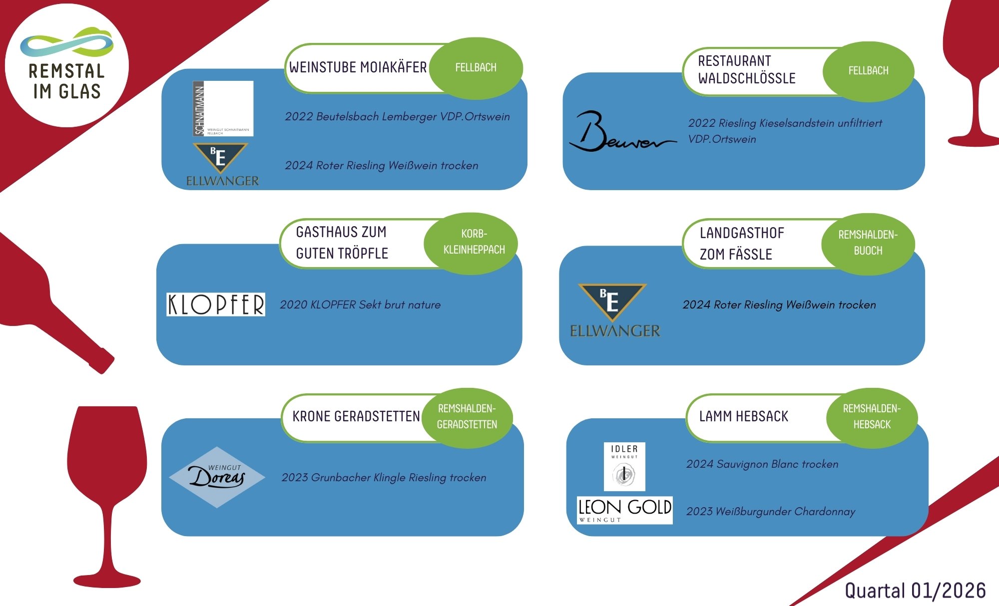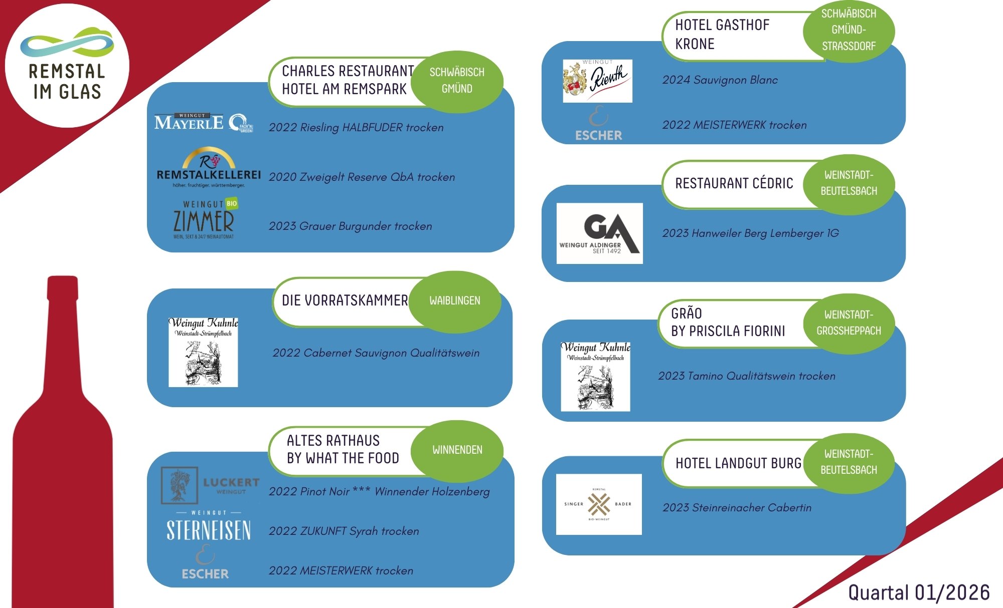 Ein Dutzend Gastronomiebetriebe im Remstal haben sich bereits zur Teilnahme bekannt – dabei steht nicht ein einheitlicher „Hauswein“ im Fokus, sondern eine individuelle Auswahl, die zeigt: Regionalität lebt vom Dialog. 24 Weingüter präsentieren ihre Weine in der gemeinsamen Angebotsliste. Dabei gilt: Jeder Betrieb entscheidet individuell, welche Weine er aufnimmt – offen, ehrlich und auf Augenhöhe.
