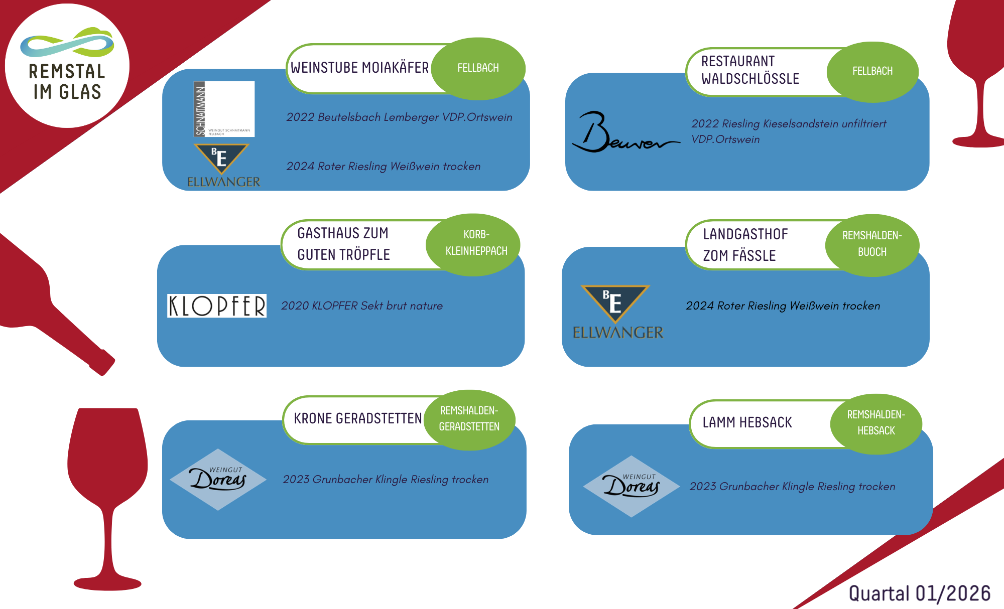 "Viertelesjährlich" wechseln die Weine ihren Charakter - aber nie die Herkunft: 100% Remstal. Probiert euch durchs Jahr, Glas für Glas. Offener Ausschank, offener Genuss!